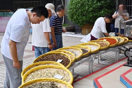 本次 “中医中药中国行——中医药健康你我他” 现场主题活动分为展览展示区、专家义诊区、互动体验区、专题讲座区、中医药文化用品发放区五个部分同时进行。在中药材展示区域,不少市民仔细辨识,认真观看,也认识了不少常用药材。夏季中药饮品——酸梅汤,引得众多市民前来品尝。