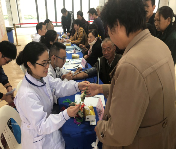 义诊现场,医护人员为老人进行心肺听诊、测血压与体检,对老人们提出的诸多问题进行了细致的解疑答惑,并对老人进行了充分的健康知识宣教,指导他们规律服药,改变不良生活习惯。本次义诊活动,从上午九点开始到下午四点结束,测量血压、血糖、心肺听诊等共计160余人次,接受现场诊治及健康咨询近200多人次,免费发放防流感香包以及各类健康教育资料300多份。