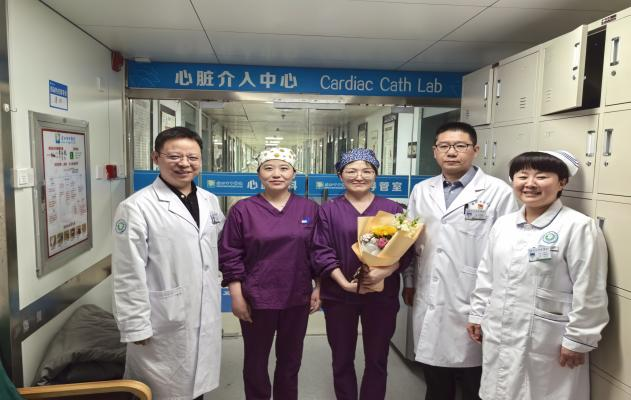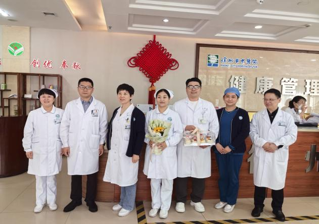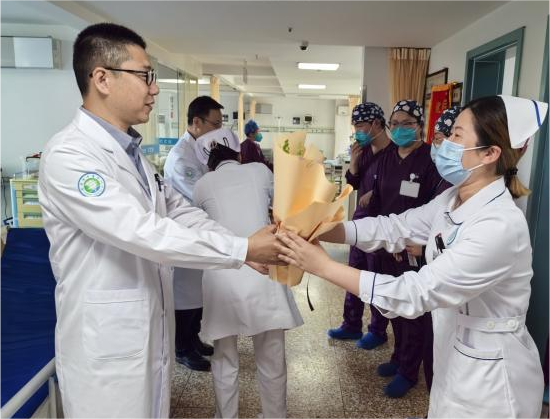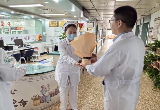 白衣天使们守护生命之光,医院祝大家节日快乐,院领导们和护理部主任送来了甜美的蛋糕与芬芳灿烂的鲜花。第一站是急诊科,抢救室里护士们正在紧张忙碌地抢救着许多患者,王洪玲护士长接过殷院长手中的鲜花和梁院长送上的蛋糕,连声致谢,喜悦与幸福溢于言表。