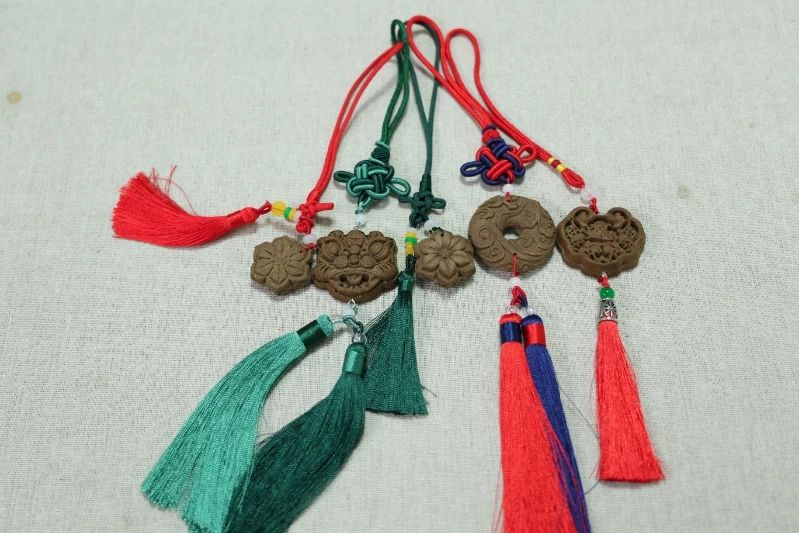 4.醒好的药泥放入石臼中反复捶打,至颜色均匀、拉伸不易断裂;5.将药泥填入香牌模具压实,用竹签轻撬边缘脱模,置于干燥通风处阴干后,穿绳装饰即可。