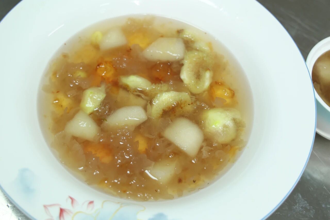 主料:桃胶10克、干银耳1朵、雪梨1个、无花果10颗、银杏10个